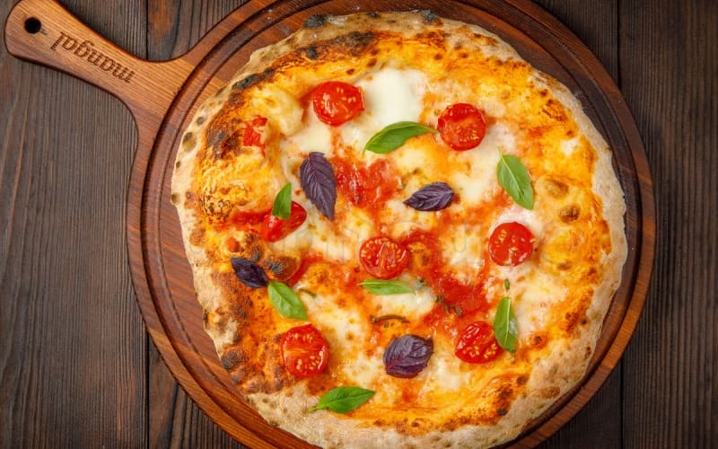 بيتزا مارجريتا الإيطالية الكلاسيكية هي مزيج مثالي من الطماطم الطازجة، الموزاريلا الطرية، الريحان العطري والقشرة المقرمشة. ستكون خياراً ممتازاً لوجبة